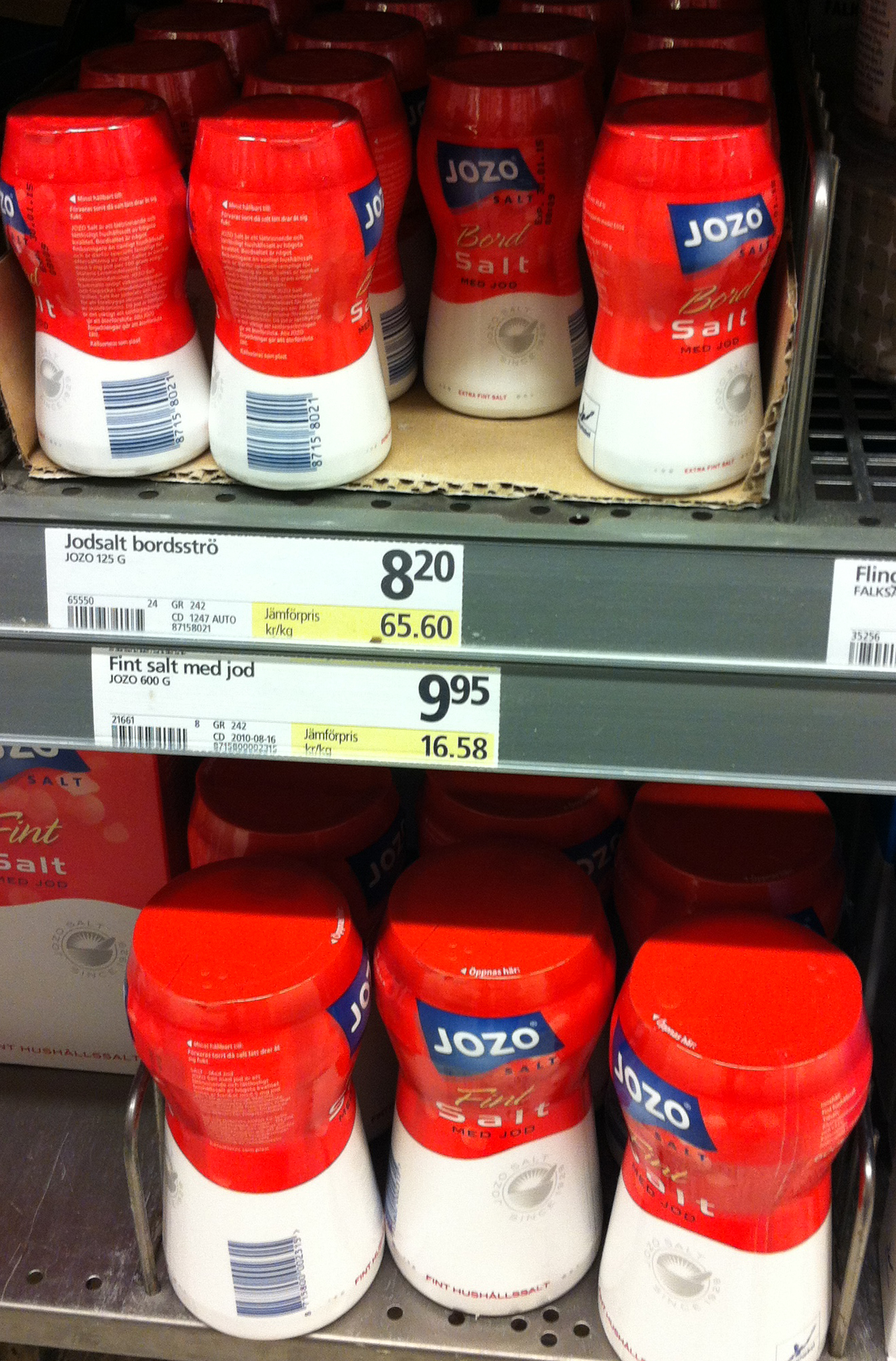 Det är ofta väldigt mycket dyrare att köpa små livsmedelsförpackningar än stora. Retar mig på det. Visst förstår jag att det kostar mer per kilo livsmedel att fylla, paketera, transportera och hantera en liten förpackning än en stor, och den ska också betala för platsen på livsmedelsbutikens hylla. Men ibland blir prisskillnaden absurd. Som denna saltförpackning. 9.95 betalar man för 600 gram och 8.20 för 125 gram. En skillnad på 400 procent. Den tar väl ändå priset – eller?