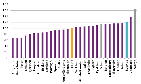 Här hittade jag en förklaring till varför Sverige hamnar högt, det beror bland annat på hur matkassen EU undersöker är sammansatt. http://foodwire.com/livsmedelsdebatt/matprisundersokningen-inga-regionala-hansyn.html